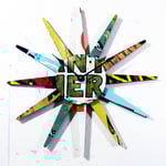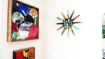 A Big (16"Dia.) version of our SkateBurst Wall Clock. A classic, mid-century starburst clock design reinterpreted using shredded skateboards as the raw material.