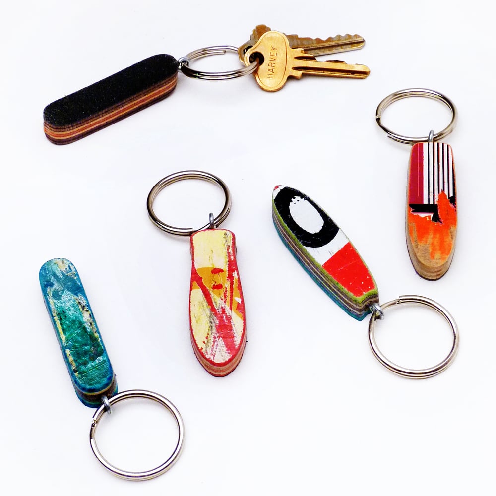Keychains are made from recycled broken skateboards (color dyed maple plywood with painted graphic on one side and real skateboard griptape on the opposite side.)