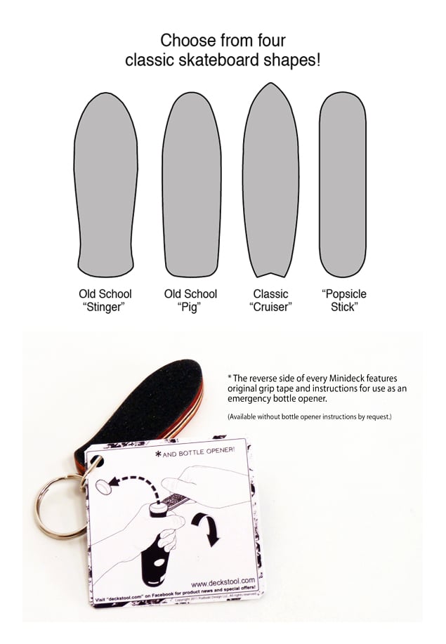 Our Mini-decks are totally rad keychains that double as an emergency bottle opener for "pop- top" bottles! (Available without bottle opener instructions by request.)
