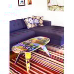 Our Recycled Skateboard Coffee Table is expertly crafted and made from 100% reclaimed and recycled broken skateboards. Cool, modern styling showcases the colorful, shredded skate graphics and the dyed plywood edges. Skateboard trucks attach the legs to the table top and a hidden steel frame underneath keeps it strong and solid.