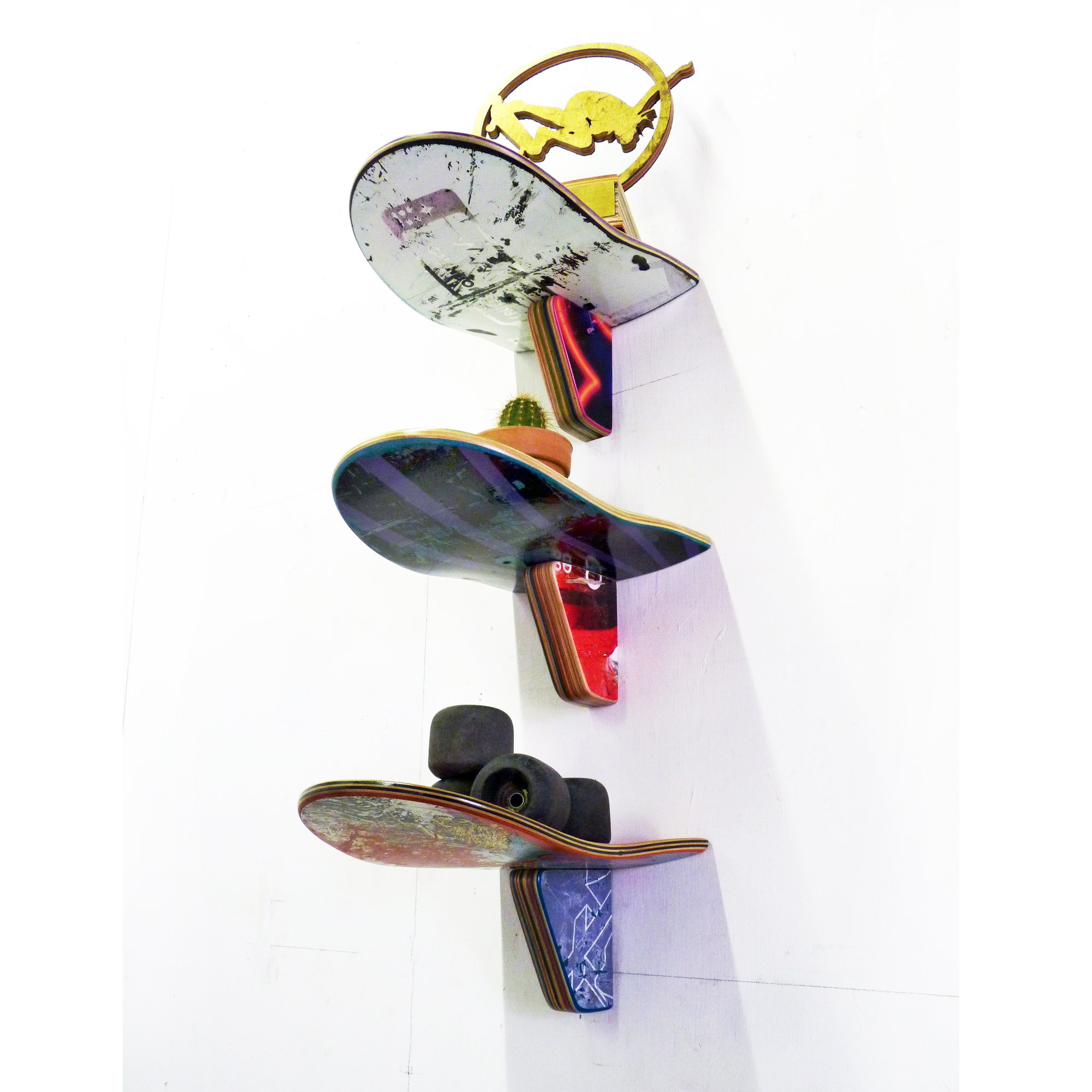 Each Recycled Skateboard Shelf may be made to order from the nose or tail of a real, used skateboard. The maple plywood shelf bracket is also made from recycled skateboards.