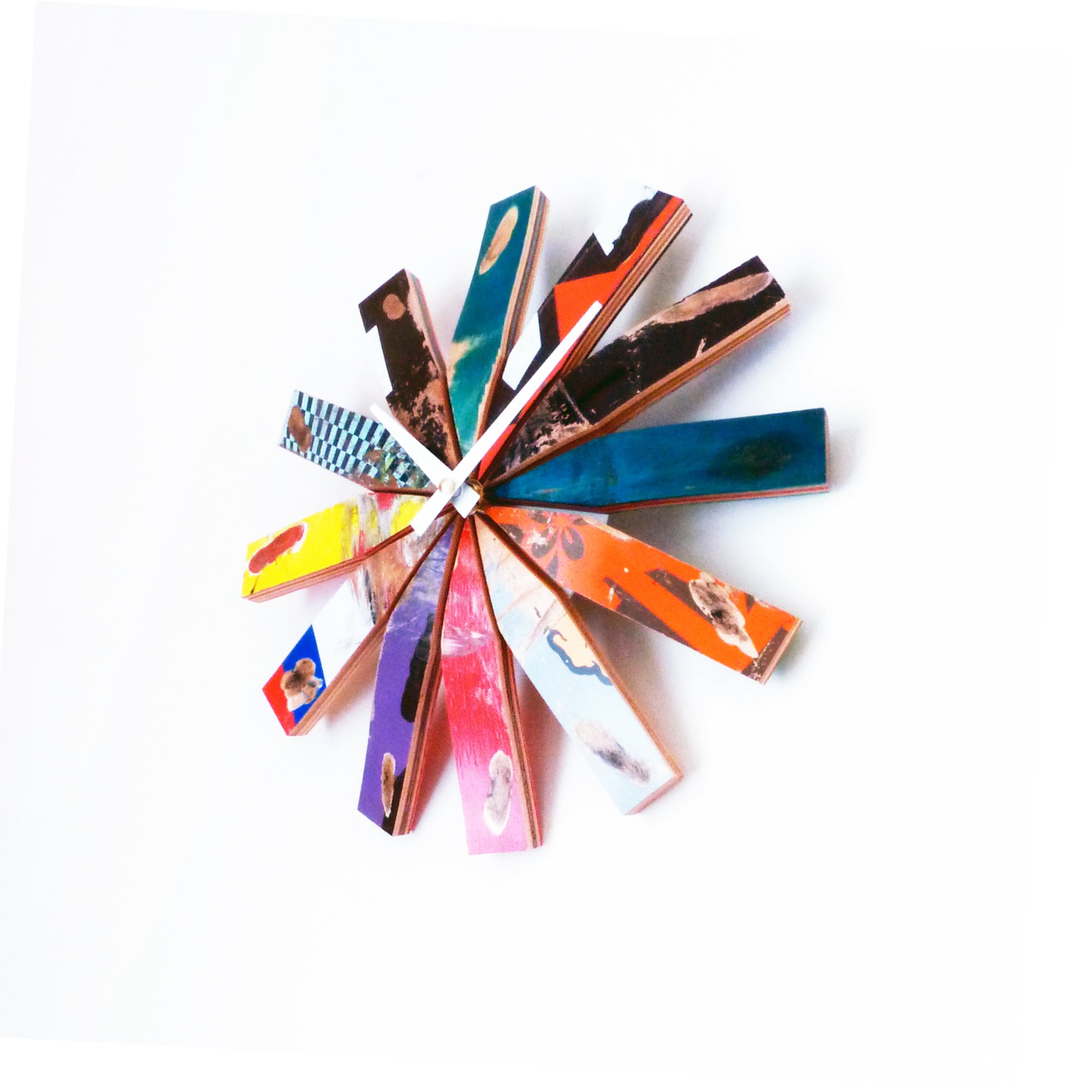 High quality, one-of-kind, Wall Clock handcrafted from 100% ripped and recycled skateboards. A cool modern design perfect for fans of recycled design, skateboarding, and street art.